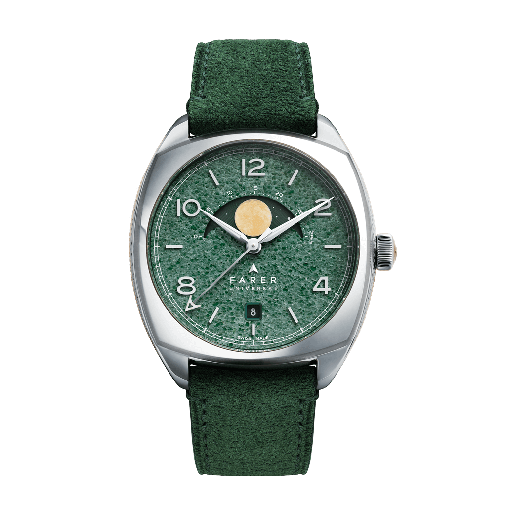 Green aventurine gloss dial with applied numerals and markers made from Grade OL X1 Super-LumiNova. Hand-painted green moonphase disc with a yellow moon in Grade OL X1 Super-LumiNova