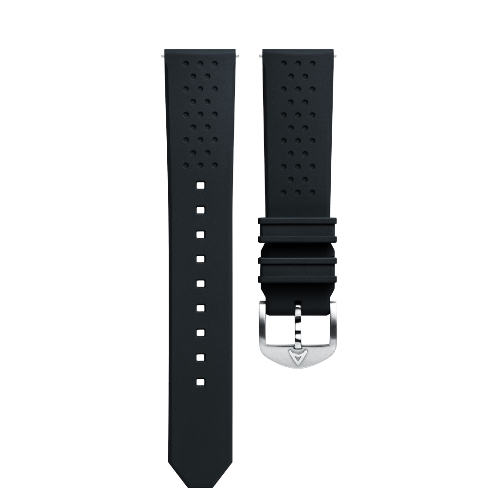 Textured, perforated natural rubber strap with 316L stainless steel buckle. Featuring quick-release spring bars, allowing you to change the straps of your watch in seconds without the use of a tool.