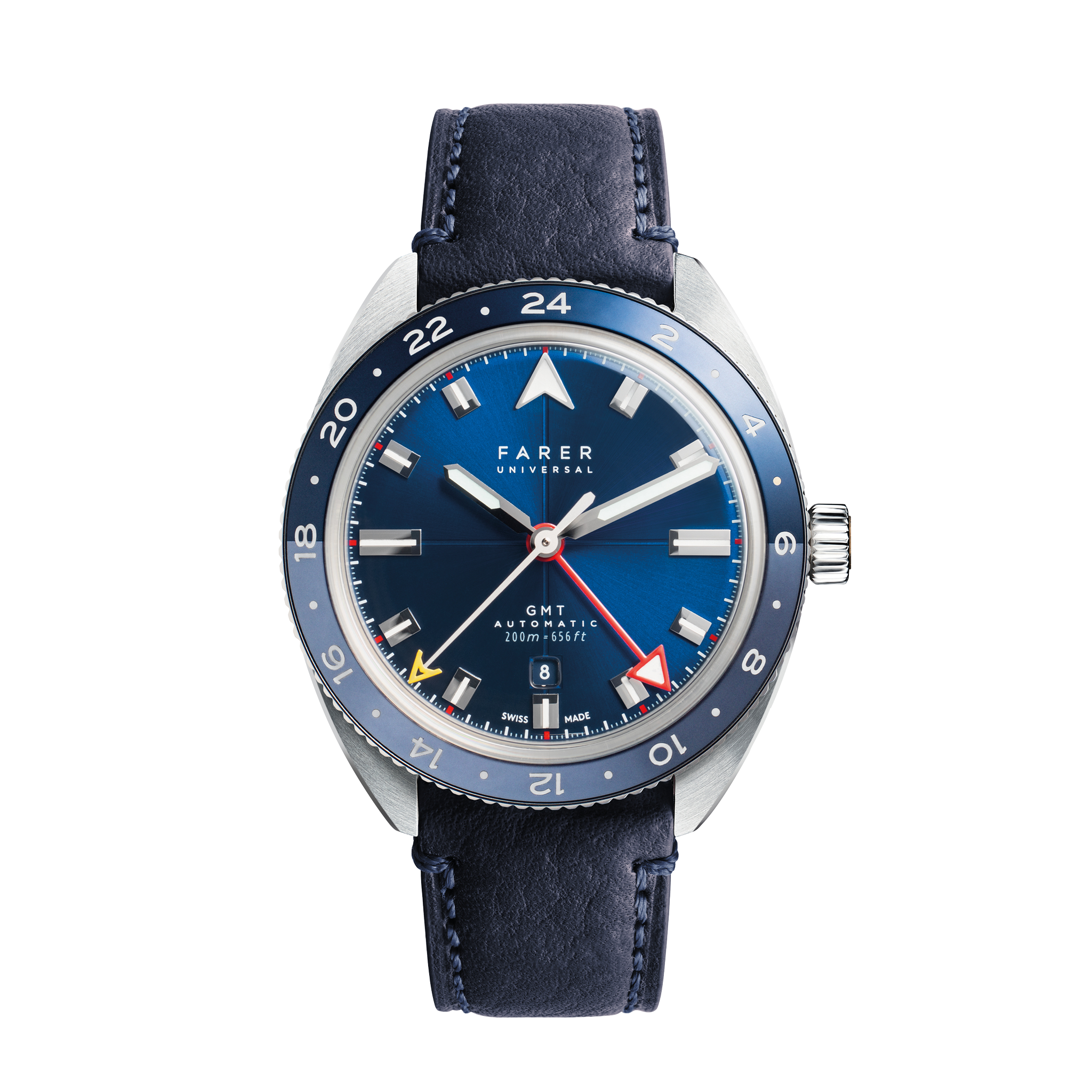 Polished steel faceted paddle style hour/minute hands infilled with Super-LumiNova Super-LumiNova Grade A ice blue, astronaut silver second sweep hand with signal yellow Farer A tip, beacon red GMT hand infilled with Super-LumiNova natural WL