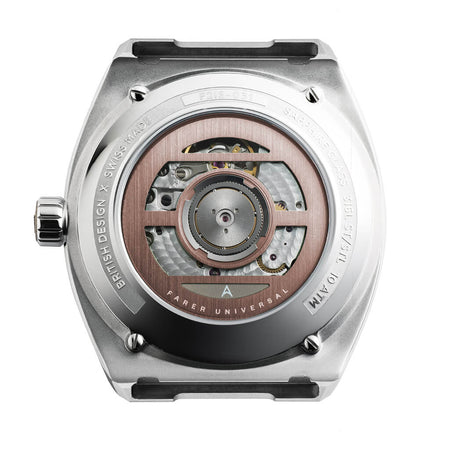 This complex dial is encased in a 38.5mm steel case that echoes its elegance. The satin brushed surfaces are punctuated by polished chamfers that highlight the Integra’s sleek silhouette and slim profile. The same can be said of the steel bracelet, with its chamfered edges and individual polished centre links. For unparalleled comfort, the concealed butterfly clasp features on-the-fly micro-adjustment that can expand the bracelet by up to 6mm. For those times that you want the Integra to feel a touch more sporty, each watch is supplied with a complementary rubber strap. These are bespoke to Farer, with segmented sections to mimic the bracelet links, and a textured underside to allow your skin to breathe.