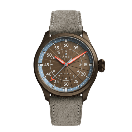 Straight solid stainless steel, machined bronze inset cap featuring embossed Farer 'A', straight solid stainless steel second off-set crown, featuring embossed World Timer marque.