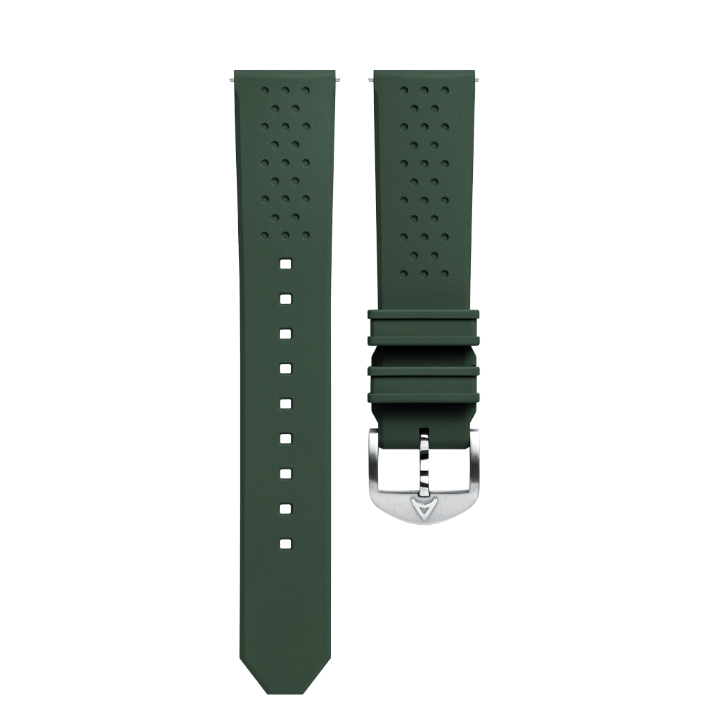 Textured, perforated natural rubber strap with 316L stainless steel buckle. Featuring quick-release spring bars, allowing you to change the straps of your watch in seconds without the use of a tool.