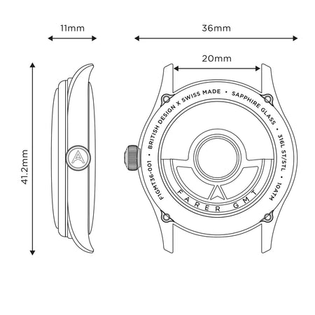 The Lander Kano 36mm lends a charming pink hue to the Lander design that’s vibrant but not overpowering. The triple-stepped dial has a sunburst finish that brings the colour to life, with bold lumed Arabic numerals and a subtle date wheel that’s colour-matched to the dial. Along the outer edge of the dial is printed a fully graduated minute track, and inside that sits a 24-hour scale for use in conjunction with the blue GMT hand. The hour and minute hands are a silver syringe handset that’s filled with Super-LumiNova, and the seconds hand is a rich fuchsia and tipped with the Farer ‘A’.
