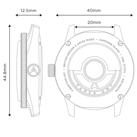Now in its third generation, the Maze is a GMT for the modern adventurer. It features a distinctive pearlescent white grid-patterned dial onto which are mounted oversized dot and dash hour markers in gloss black, whilst the marker at twelve is in the shape of the Farer logo. These markers are paired with a straight sword handset that’s also in gloss black, which provides the best contrast for telling the time from any angle. To guarantee legibility in darkness, these hands and markers are packed full of ice-blue X1 Super-LumiNova. The silver seconds hand features a bright blue Farer “A” at its tip, whilst the GMT hand is a bold “postbox red”. This GMT hand is used in conjunction with the bidirectional rotating bezel. Underneath a sapphire insert is a 24-hour scale that allows you to track a second time zone.