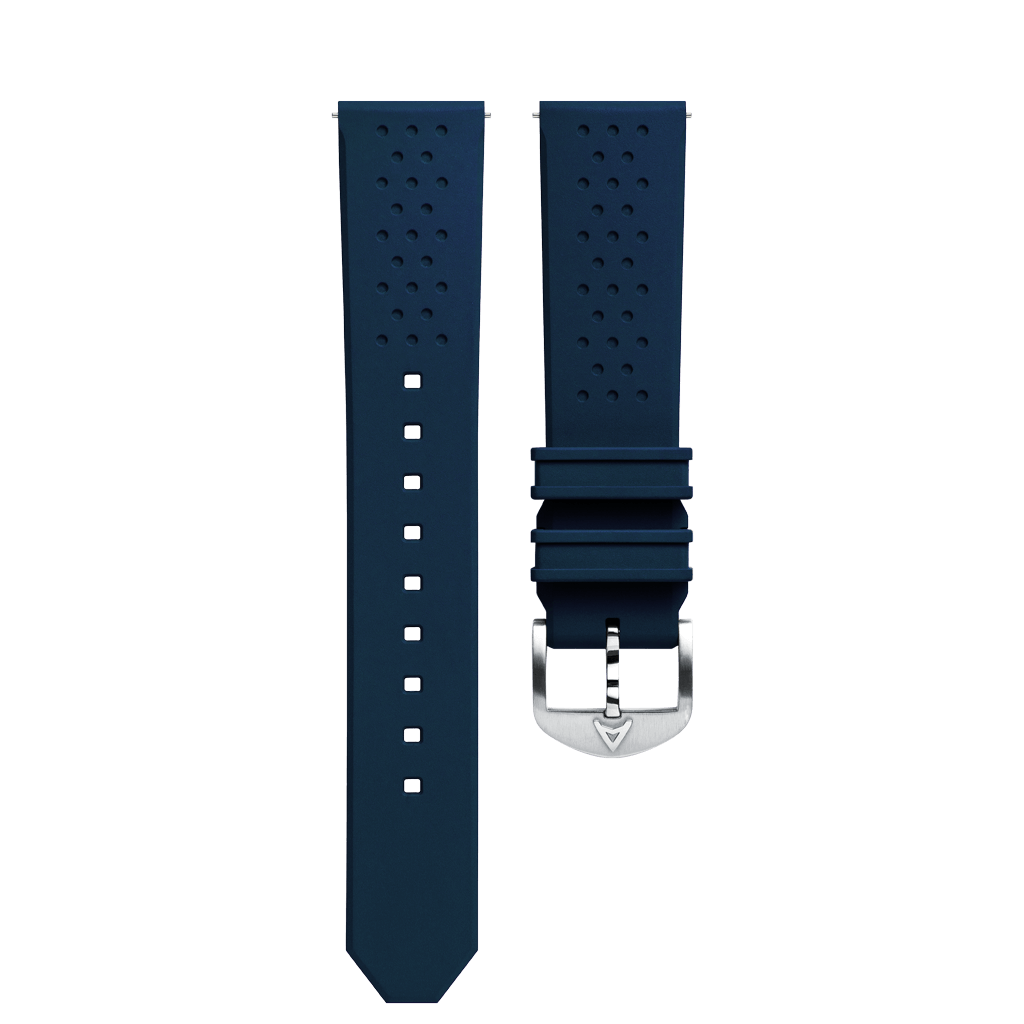 Textured, perforated natural rubber strap with 316L stainless steel buckle. Featuring quick-release spring bars, allowing you to change the straps of your watch in seconds without the use of a tool.