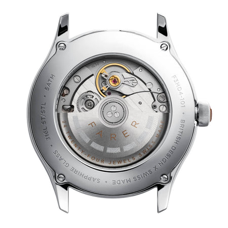 The Resolute II is the epitome of what Farer stands for. It takes classic design elements and brings them up to date with bold colours and modern manufacturing techniques. Mounted on the pure white gloss dial are twelve numerals fashioned from ice blue Super-LumiNova. These numerals are capped with a matte black finish that not only gives the dial a very high contrast in daylight but also produces a stunning visual effect when the lume lights up in the dark. These numbers are complemented by a matching black syringe handset and a vibrant burnt orange seconds hand.
